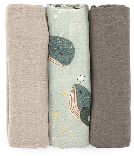 PETITEMARS PETITE&MARS Bambusz muszlin 3 részes pelenka szett Moussy Whale Song 68 x 68 cm
