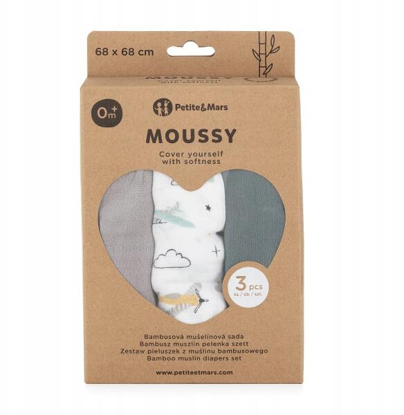 Petite&Mars Muszlin pelenka 3 db Petite&Mars Moussy Grey Planes 68cm x 68cm (8596202005865)