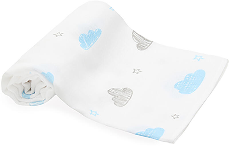Két oldalán szegett, 70×70 cm-es, tetra textil pelenka, kék felhős mintával.